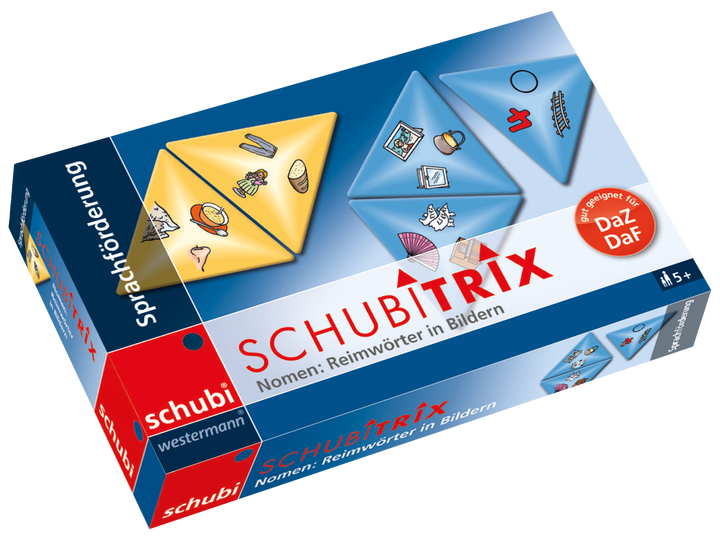 Mit diesem Dreieckdomino aus der SCHUBITRIX-Reihe können auch Kinder ohne Lesefähigkeiten Reimpaare suchen und einander zuordnen.