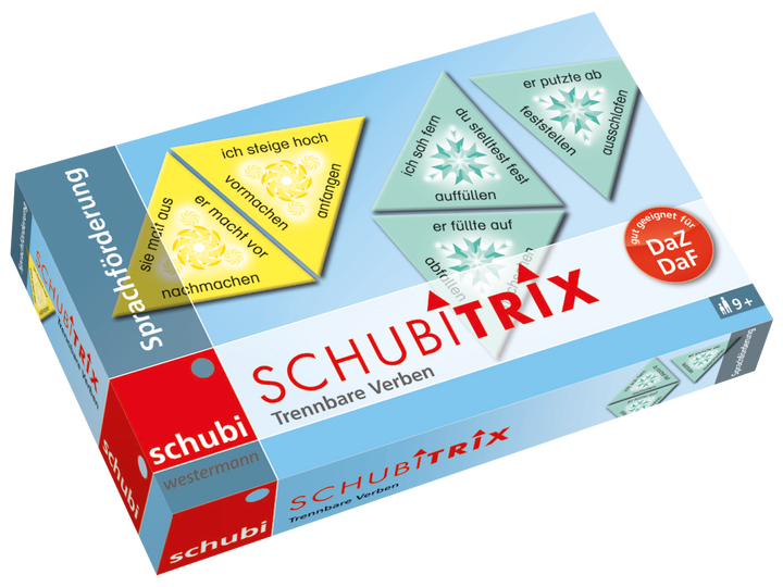 Trennbare Verben: ein verzwicktes Thema im Deutschen! Haben die Spieler aber erstmal die SCHUBITRIX-Lösungsbilder gelegt, wissen sie garantiert, welche Vorsilben im Präsens oder Präteritum nach hinten wandern. Hervorragend als Einstieg ins Thema Trennbare Verben geeignet.
