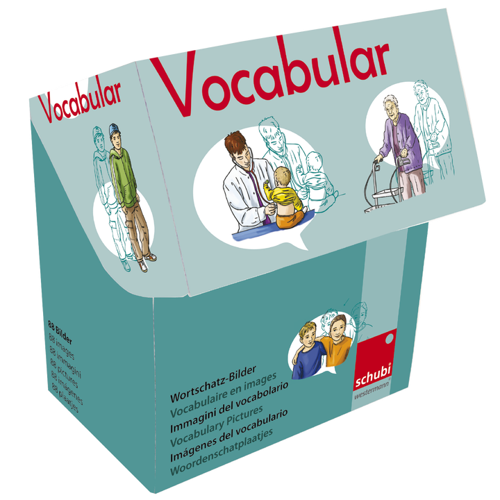 Die farbigen VOCABULAR Wortschatz-Bilder in der Klappbox eignen sich zur Sprachförderung in allen Altersstufen, zur Erarbeitung des Wortschatzes im frühen Fremdsprachenunterricht in der Schule, aber auch für die Sonderpädagogik, die Sprachtherapie und die Arbeit mit Erwachsenen.