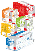 La gamme 1-2-3 sans les doigts avec des jeux de stratégie pour remédier à la dyscalculie se compose de cinq boîtes. Chaque boîte peut être utilisée seule, de manière complètement indépendante des autres, en fonction du niveau de développement de l’enfant. Comme les exercices des boîtes sont conçus expressément en lien les uns avec les autres, il est possible de les utiliser les uns après les autres dans le cadre de la thérapie.