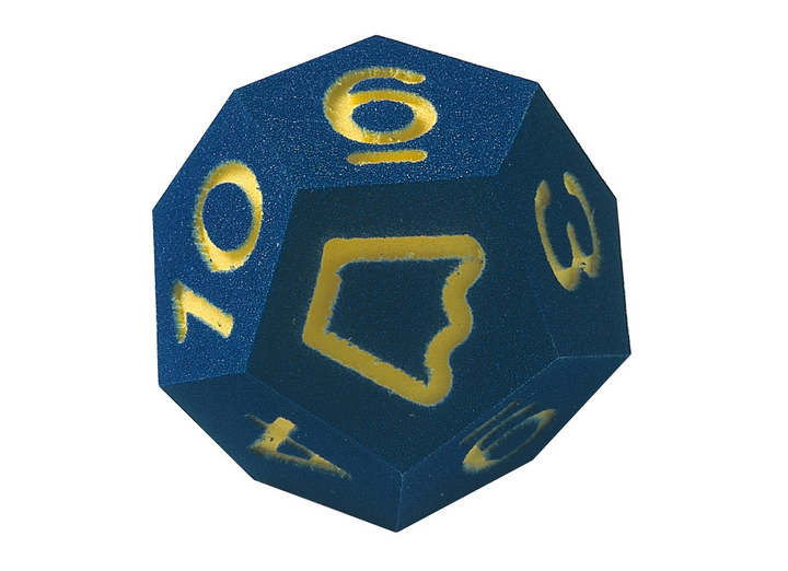 Dodécaèdre 0 à 10 + joker, Ø 22 cm env. En mousse avec des chiffres gravés.