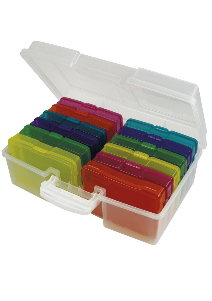Set aus 12 farbig-transparenten Kunststoff-Boxen, die platzsparend im Kunststoff-Koffer verwahrt werden können.