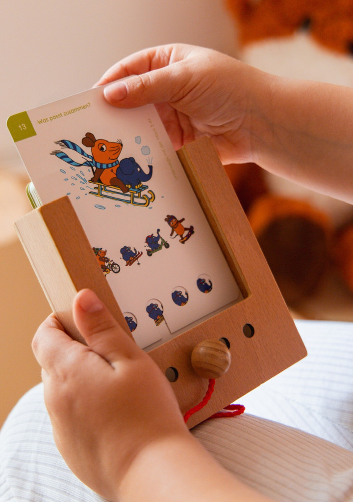 Die Kinder stecken die Karte ein, wählen die passende Lösung und prüfen ihr Ergebnis sofort – denn nur bei richtiger Zuordnung lässt sich die Karte mühelos herausziehen. Dieses einfache Prinzip der Selbstkontrolle stärkt die Eigenständigkeit und sorgt für direkt erlebte Erfolgsmomente.